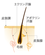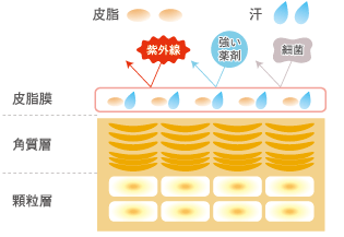 皮脂膜は、角質層の表面に存在し、体全体を覆っている天然の保護膜です。この皮脂膜は皮脂と汗が混ざり合ったもので、さまざまな外的刺激(紫外線、強い薬剤、細菌など)からの保護や皮膚の保湿などの働きをしています。
